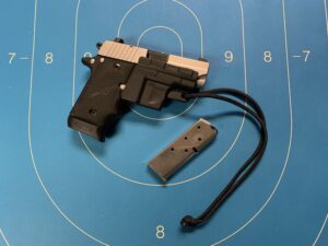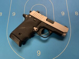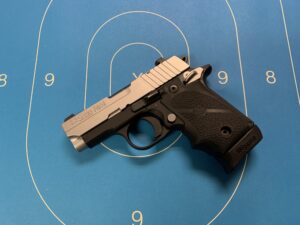 This two tone model P238 comes with the optional Hogue rubber finger grove grips, includes two magazines, one with a finger extension and also comes with original box and holster. This compact semi auto, chambered for .380, remains in like new condition. The price is $695.
